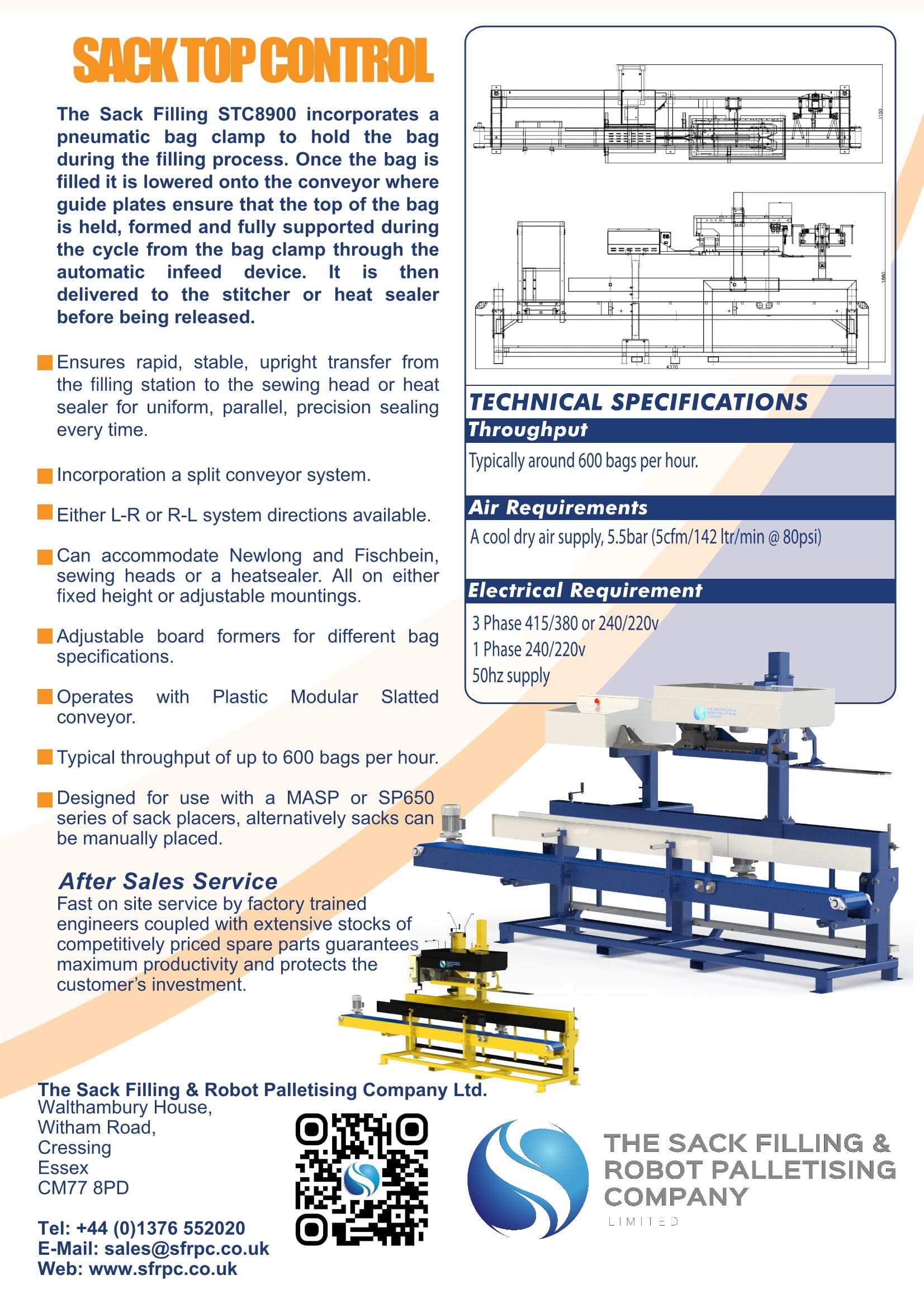 The Morray STC8900 incorporates a pneumatic bag clamp to hold the bag during the filling process. Once the bag is filled it is lowered onto an Intralox conveyor, at the same time two spreader fingers descend with the sack and spread the sack top. Two support arms then hold the sack top in the spread position and convey the filled sack forward to the stitcher or heat sealer before being released. The sack is supported at all times during this cycle to ensure an even, uniform seal every time.